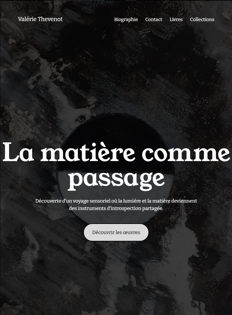 Création d’un site vitrine pour permettre à Valérie Thevenot, artiste plasticienne, de présenter son travail et disposer d’une présence digitale claire et structurée.